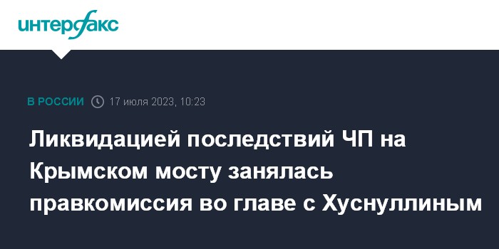 Москва. 17 июля. INTERFAX.RU - Ликвидацией последствий ЧП на Крымском мосту занимается правительственная комиссия под руководством вице-премьера РФ Марата Хуснуллина, такое распоряжение отдал премьер-министр Михаил Мишустин.