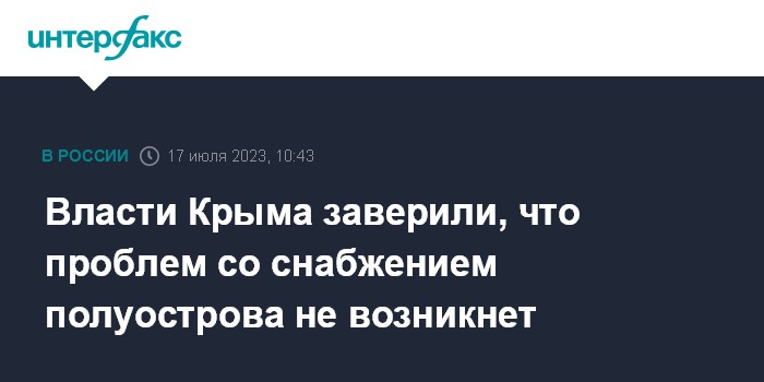 Москва. 17 июля. INTERFAX.RU - Власти Крыма не ожидают проблем со снабжением Крыма после теракта на мосту, ведущем на полуостров со стороны Краснодарского края, заявил советник главы республики Олег Крючков.