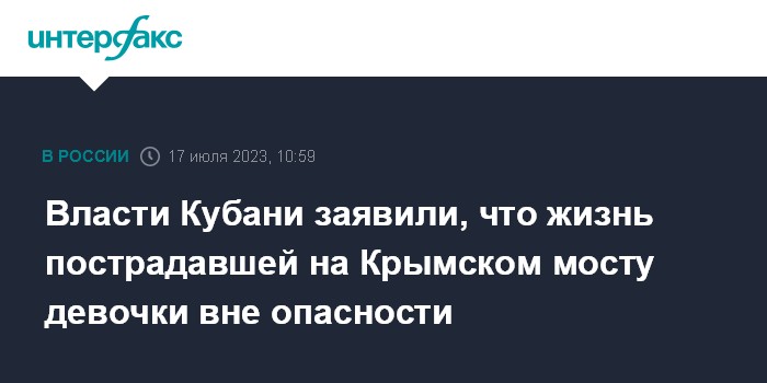 Москва. 17 июля. INTERFAX.RU - Пострадавшая в происшествии на Крымском мосту девочка в сознании, дышит самостоятельно, сообщила вице-губернатор Краснодарского края Анна Минькова в своем телеграм-канале.