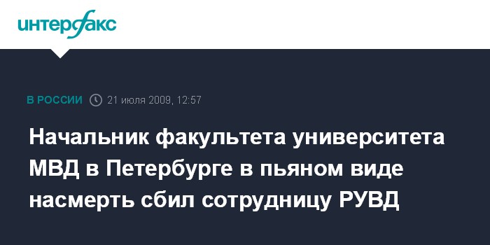 Москва. 21 июля. INTERFAX.RU - В Петербурге начальник факультета подготовки оперативных работников Санкт-Петербургского университета МВД РФ, подполковник милиции Сергей Носов сбил насмерть сотрудницу РУВД, сообщает сайт Следственного управления СКП РФ по Северной столице. Как говорится в сообщении, около 2:00 27 июня на улице Доблести Носов 1970 г.р., управляя в состоянии алкогольного опьянения автомобилем Mitsubishi Pajero, сбил сотрудницу канцелярии РУВД Красносельского района 1987 г. рождения. От полученных повреждений потерпевшая скончалась на месте происшествия.