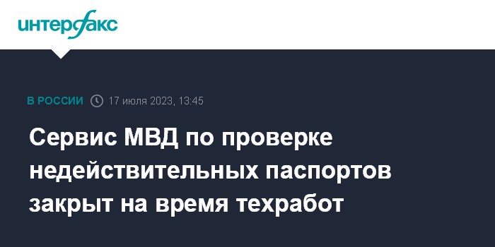Москва. 17 июля. INTERFAX.RU - Онлайн-сервис МВД по проверке российских паспортов на действительность недоступен, поскольку на сайте Главного управления по вопросам миграции проводят технические работы, сообщил пресс-центр МВД.