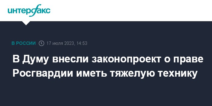 Москва. 17 июля. INTERFAX.RU - В Госдуму внесен законопроект № 402872-8, который даст Росгвардии право иметь на вооружении военную, в том числе тяжелую, технику.