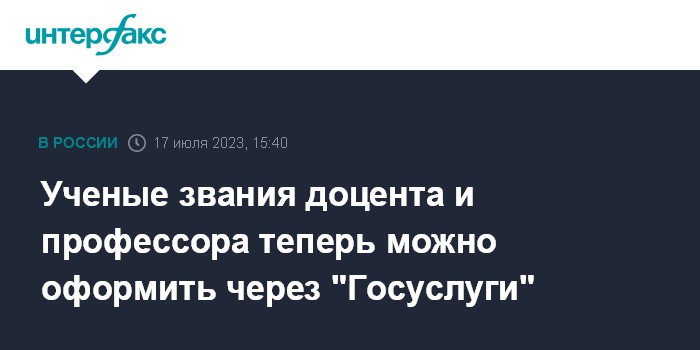 Москва. 17 июля. INTERFAX.RU - Вузы и научные организации теперь смогут оформлять звания доцента и профессора через портал "Госуслуг", сообщили журналистам в пресс-службе Минобрнауки РФ в понедельник.