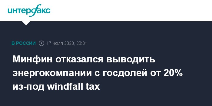 Минфин отказался выводить энергокомпании с госдолей от 20% из-под windfall tax