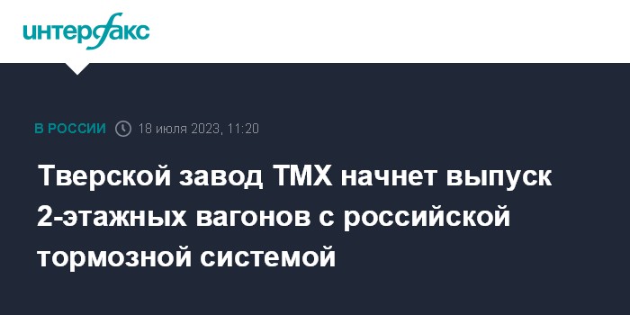 Москва. 18 июля. INTERFAX.RU - ОАО "Тверской вагоностроительный завод" (ТВЗ, входит в "Трансмашхолдинг", ТМХ) до конца 2023 года начнет выпускать двухэтажные вагоны с отечественной тормозной системой, сообщила пресс-служба правительства Тверской области.