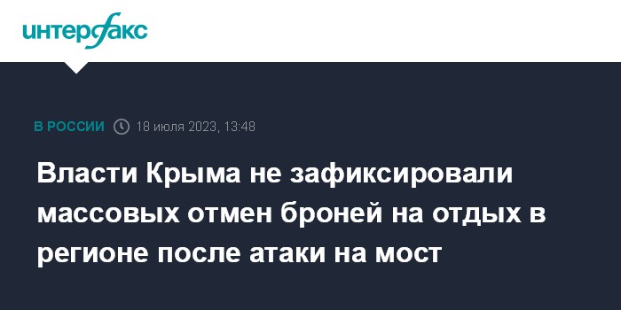 Москва. 18 июля. INTERFAX.RU - Туроператоры и чиновники не фиксируют массовых отмен броней на отдых в Крыму после украинской атаки на Крымский мост, сообщил министр курортов и туризма республики Вадим Волченко.