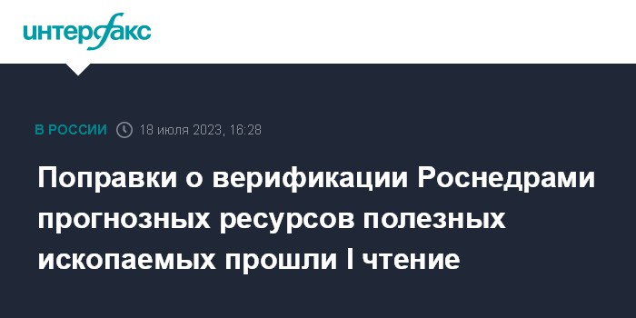 Москва. 18 июля. INTERFAX.RU - Госдума приняла в первом чтении законопроект, который наделит Роснедра функцией верификатора прогнозных ресурсов полезных ископаемых, представляемых компаниями.