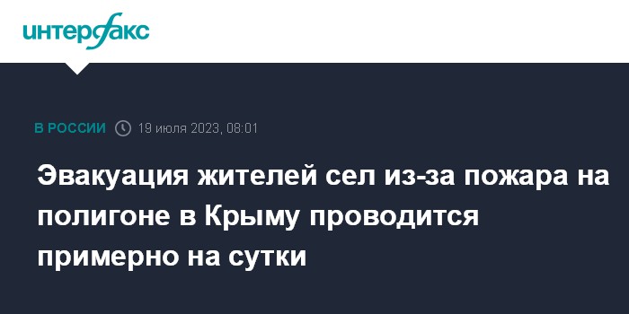 Москва. 19 июля. INTERFAX.RU - Жителей населенных пунктов близ полигона, который горит на востоке Крыма, отселяют ориентировочно на сутки, сообщил советник главы республики Олег Крючков.