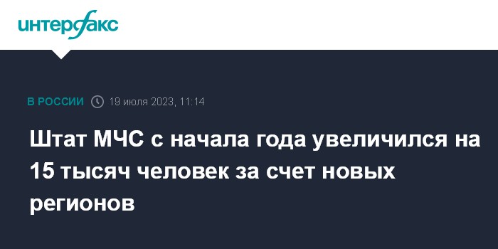 Москва. 19 июля. INTERFAX.RU - Предельная численность штата МЧС России увеличилась на 15 тысяч специалистов и составляет 303 107 человек, сообщил в Совете Федерации глава ведомства Александр Куренков. За счет этого министерство формирует территориальные органы и подразделения в новых регионах.