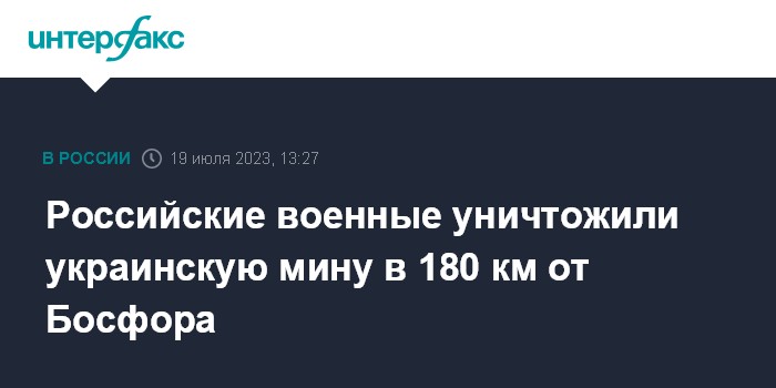 Москва. 19 июля. INTERFAX.RU - Черноморский флот России сообщил об уничтожении дрейфующей украинской мины в 180 километрах от пролива Босфор.