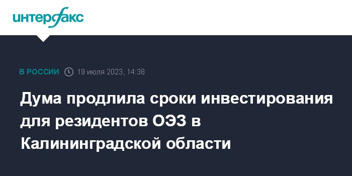 Москва. 19 июля. INTERFAX.RU - Госдума приняла в третьем чтении закон, который позволяет увеличить с трех до шести лет срок инвестиционного проекта, реализуемого на территории Калининградской области, для компаний, включенных в реестр резидентов Особой экономической зоны (ОЭЗ) с 1 января 2020 года по 31 декабря 2021 года.