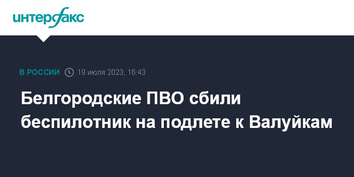 Москва. 19 июля. INTERFAX.RU - Система ПВО сбила беспилотник, подлетавший к Валуйкам, сообщил в Telegram губернатор Белгородской области Вячеслав Гладков. По его словам, последствия инцидента уточняют оперативные службы.