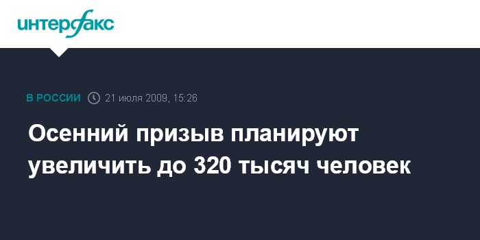 Москва. 21 июля. INTERFAX.RU - Около 320 тысяч призывников планируется призвать на военную службу осенью 2009 года, заявил замначальника Генштаба Вооруженных сил РФ, начальник главного организационно-мобилизационного управления Генштаба генерал-полковник Василий Смирнов.