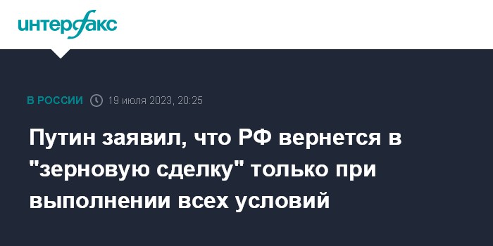 Москва. 19 июля. INTERFAX.RU - РФ не является противником "зерновой сделки" и готова вернуться в нее, как только будут выполнены все основные условия, выдвигавшиеся российской стороной, но так и не выполненные к моменту истечения последнего дедлайна 17 июля, заявил президент Владимир Путин на совещании с правительством в среду.