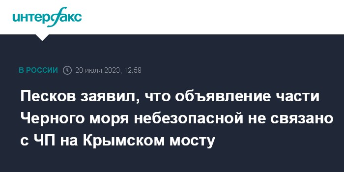 Москва. 20 июля. INTERFAX.RU - Объявление министерством обороны России ряда районов Черного моря небезопасными для судоходства связано с прекращением действия "зерновой сделки" и не имеет отношения к взрыву на Крымском мосту, заявил пресс-секретарь президента РФ Дмитрий Песков.