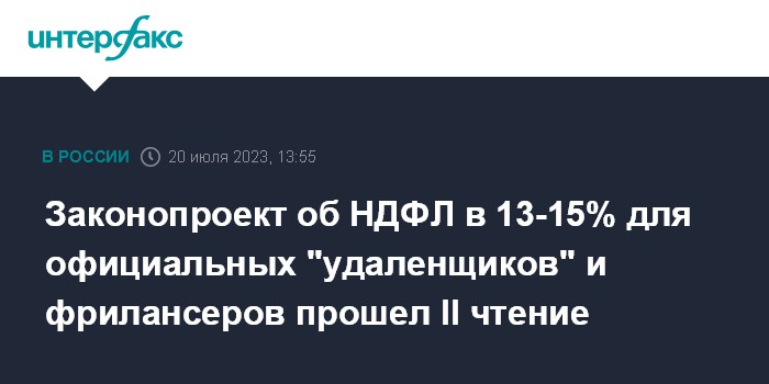 Москва. 20 июля. INTERFAX.RU - Госдума приняла во втором чтении правительственный законопроект о взимании НДФЛ по стандартным ставкам в 13-15% с заработков тех россиян, кто в силу переезда за границу утратил отечественное налоговое резидентство, но остается штатным "дистанционным" сотрудником, и ряда фрилансеров, работающих на российских заказчиков. Новые правила должны начать действовать для первых с 2024 года и с 2025 года для вторых.