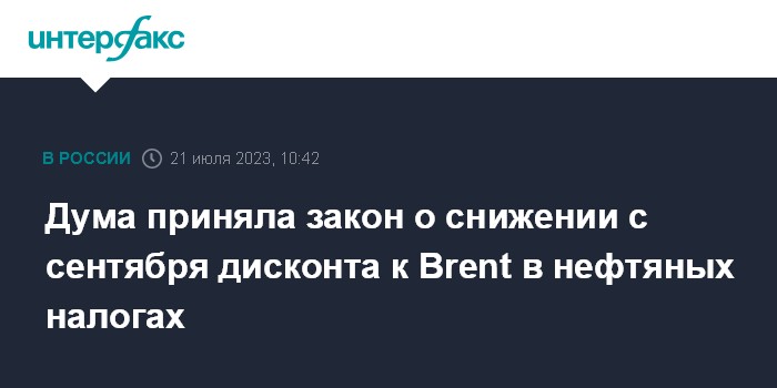 Москва. 21 июля. INTERFAX.RU - Госдума приняла в третьем чтении закон, по которому с 1 сентября 2023 года предлагается снизить дисконт нефти к сорту Brent в отечественных нефтяных налогах (НДПИ и НДД) до $20 за баррель, сейчас этот дисконт установлен на уровне $25 за баррель.