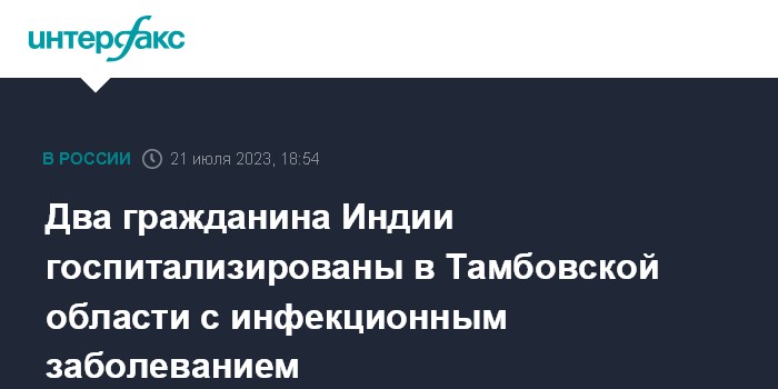 Москва. 21 июля. INTERFAX.RU - Два гражданина Индии попали в больницу в Тамбовской области с инфекционным заболеванием, их состояние удовлетворительное, еще около 400 человек, контактировавших с заболевшими, обследованы, признаков заболевания не выявлено, сообщили в региональном управлении Роспотребнадзора.