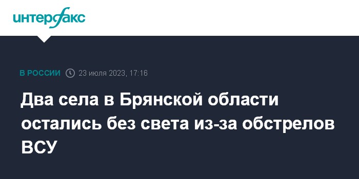 Москва. 23 июля. INTERFAX.RU - Два села обесточены в Брянской области после обстрелов со стороны Украины, сообщил в воскресенье губернатор региона Александр Богомаз.