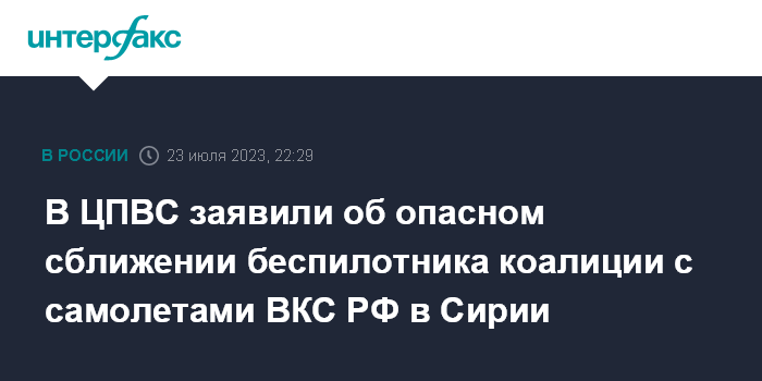 Москва. 23 июля. INTERFAX.RU - Беспилотный летательный аппарат международной коалиции во главе с США произвел опасное сближение с самолетами ВКС РФ в небе над Сирией, сообщил замглавы российского Центра по примирению враждующий сторон (ЦПВС) в САР контр-адмирал Олег Гуринов в воскресенье.