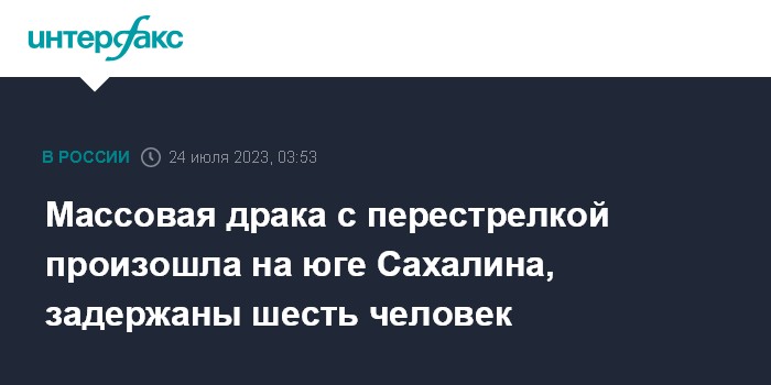 Москва. 24 июля. INTERFAX.RU - Два уголовных дела возбудила полиция по фактам массовой драки со стрельбой в минувшую субботу в городе Долинске на юге Сахалина, задержаны шестеро подозреваемых, сообщила пресс-служба УМВД по Сахалинской области.