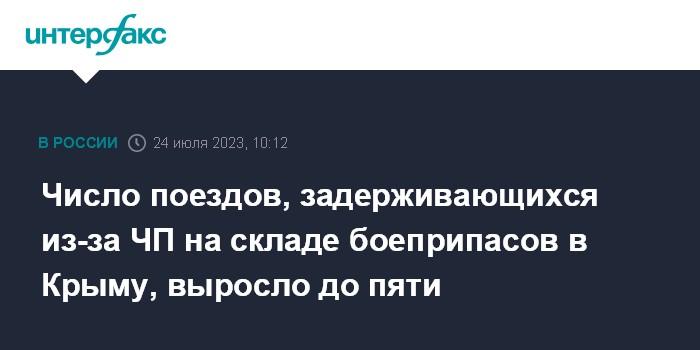 Москва. 24 июля. INTERFAX.RU - Пять поездов следуют с опозданием в связи с остановкой движения на перегоне в Джанкойском районе на севере Крыма после ЧП на складе боеприпасов, сообщил оператор железнодорожных перевозок "Гранд Сервис Экспресс" (ГСЭ).