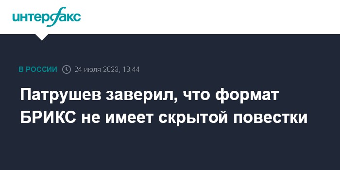Москва. 24 июля. INTERFAX.RU - Секретарь Совбеза России Николай Патрушев заявил, что формат БРИКС не имеет конфронтационной или скрытой повестки, что делает его привлекательным для многих государств глобального Юга и Востока.