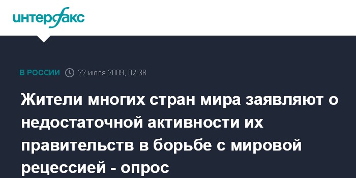 Вашингтон. 21 июля. ИНТЕРФАКС - Население в 14 странах мира полагает, что их правительства недостаточно активно борются с глобальной рецессией, говорится в докладе, подготовленном организацией "Уорлд паблик опиньон" по результатам опроса, проведенного в 19 государствах.