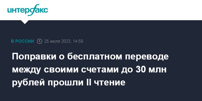 Поправки о бесплатном переводе между своими счетами до 30 млн рублей прошли II чтение