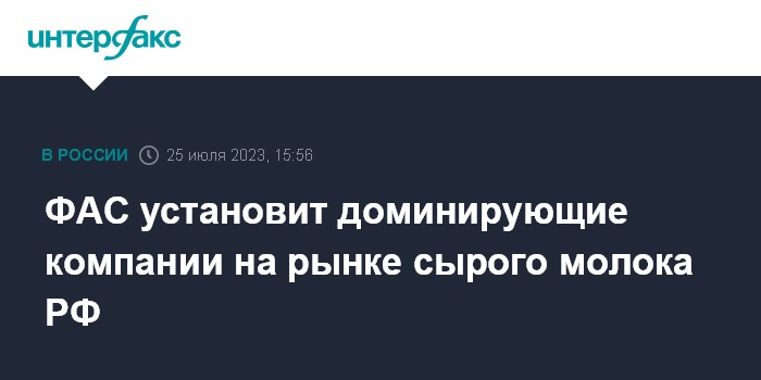 Москва. 25 июля. INTERFAX.RU - ФАС России в рамках проверки ценообразования на молочном рынке планирует установить компании, занимающие доминирующее положение на рынке сырого молока, говорится в сообщении службы.