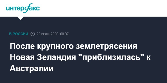 Москва. 22 июля. INTERFAX.RU - Землетрясение силой 7,8 баллов по шкале Рихтера, которое на прошлой неделе произошло в Новой Зеландии, "сдвинуло" остров Южный в сторону Австралии на расстояние от 300 до 100 мм, сообщает в среду новозеландская геологическая служба Геонет. Эпицентр этого землетрясения находился на юге страны в районе Фиорлэнд. Жертв и разрушений не было. После землетрясения была объявлена тревога в связи с возможностью возникновения цунами, однако и она вскоре была отменена.