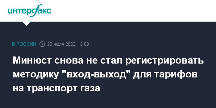 Москва. 26 июля. INTERFAX.RU - Федеральная антимонопольная служба во второй раз потерпела неудачу с регистрацией обновленной методики расчета тарифов на магистральный транспорт газа по принципиально новой модели - "плата за вход - плата за выход". Работа над проектом документа продолжается больше года.