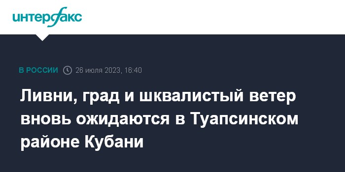 Москва. 26 июля. INTERFAX.RU - В пострадавшем из-за сильных осадков Туапсинском районе Краснодарского края снова прогнозируется ухудшение погоды, сообщает в среду пресс-служба районной администрации.