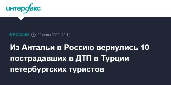 Москва. 22 июля. INTERFAX.RU - Из Антальи на родину вернулись 10 из 12 пострадавших в ДТП в Турции петербургских туристов, сообщила "Интерфаксу" пресс-секретарь управления по туризму комитета по инвестициям и стратегическим проектам города Галина Громова в среду. Она уточнила, что двое туристов остались в Москве у родственников, в Петербург прибыли восемь человек. У троих из них наложены повязки, чувствуют все себя хорошо. По словам Громовой, в настоящее время в турецких госпиталях остаются Андрей Кожевников, получивший травму челюсти, и его друг Александр Кузак.