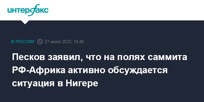Москва. 27 июля. INTERFAX.RU - Ситуация с мятежом в Нигере активно обсуждается на российско-африканском саммите в Петербурге, заявил пресс-секретарь президента РФ Дмитрий Песков.