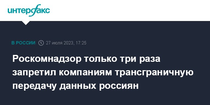 Москва. 27 июля. INTERFAX.RU - С 1 марта в Роскомнадзор поступили 733 уведомления о намерении компаний осуществлять трансграничную передачу персональных данных россиян, из этих случаев передача была запрещена только три раза, сообщила на на вебинаре по защите персональных данных специалист РКН Анна Кононенко.