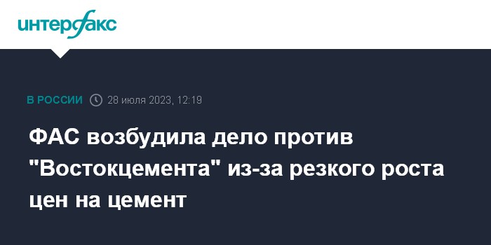 Москва. 28 июля. INTERFAX.RU - Федеральная антимонопольная служба (ФАС) России выявила признаки нарушения антимонопольного законодательства в действиях группы лиц в составе ООО "Востокцемент" (управляющая компания холдинга "Востокцемент") и АО "Спасскцемент" (крупнейший производитель цемента на Дальнем Востоке, входит в "Востокцемент") и возбудило дело по факту резкого роста цен на цемент.