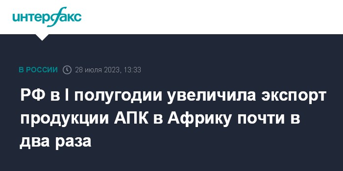 "У нас товарооборот (продукции АПК - ИФ) со странами Африки растет. В первом полугодии он вырос на 60% и достиг $4,5 млрд. Серьезная цифра. И мы, конечно, не планируем останавливаться на достигнутом. При этом, если смотреть на экспорт российской продукции АПК, то в первом полугодии он вырос почти в два раза и на сегодняшний день составляет $3,3 млрд", - сказал он.