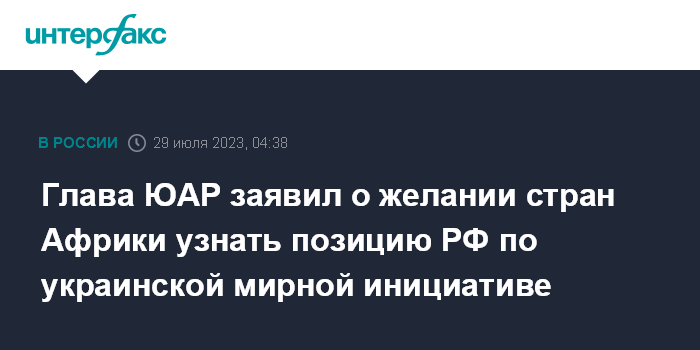 Москва. 29 июля. INTERFAX.RU - Президент ЮАР Сирил Рамафоса заявил, что главная цель визита лидеров африканских государств в России - выслушать позицию президента России Владимира Путина на их мирную инициативу по Украине, а не повод добиться поставок зерна.