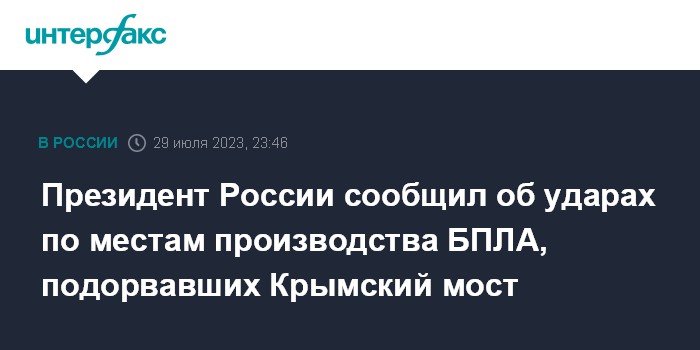 Москва. 29 июля. INTERFAX.RU - Президент РФ Владимир Путин заявил, что охрана Крымского моста будет усилена и сообщил, что российские военные нанесли превентивные удары по местам производства украинских беспилотников.