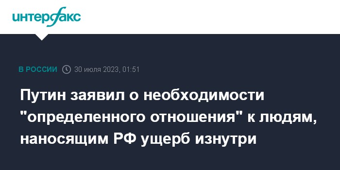 Москва. 30 июля. INTERFAX.RU - Президент РФ Владимир Путин, комментируя ряд арестов в стране, заявил, что необходимо "определенное отношения" к людям, которые наносят России ущерб изнутри во время вооруженного конфликта с соседним государством.