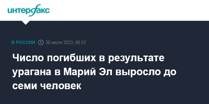 Москва. 30 июля. INTERFAX.RU - Семь человек погибли и еще 22 пострадали на отдыхе с палатками у озера в Марий Эл в результате урагана, сообщает пресс-служба ГУ МЧС России по республике в воскресенье.
