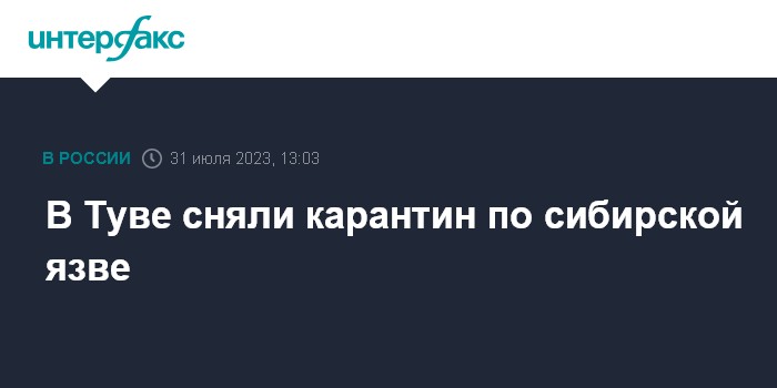 Москва. 31 июля. INTERFAX.RU - Снят карантин по сибирской язве, введенный ранее в Барун-Хемчикском районе Тувы, сообщает правительство республики.