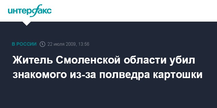 Смоленск. 22 июля. INTERFAX.RU - В Смоленской области передано в суд уголовное дело в отношении 45-летнего жителя Рудни, забившего знакомого до смерти за полведра картошки, сообщила "Интерфаксу" в среду старший помощник начальника СУ СКП по Смоленской области Наталья Хомутова.