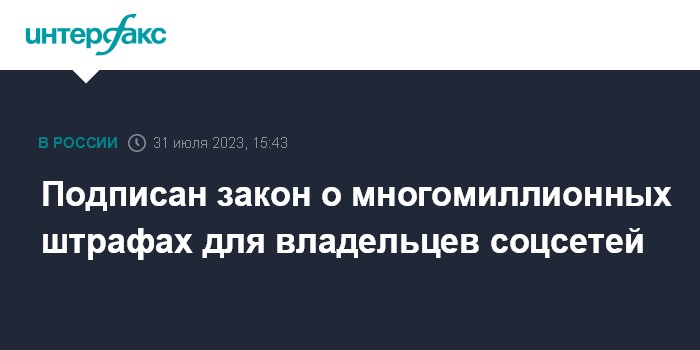 Москва. 31 июля. INTERFAX.RU - Президент Владимир Путин подписал закон, повышающий ответственность владельцев социальных сетей и сервисов объявлений за нарушение установленных законом обязанностей. Закон предусматривает для них штрафы в размере до 8 млн рублей.