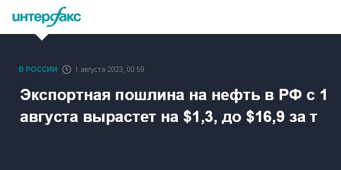 Москва. 1 августа. INTERFAX.RU - Экспортная пошлина на нефть в РФ с 1 августа 2023 года вырастет на $1,3 - с $15,6 до $16,9 за тонну, отмечается в расчетах Минфина.