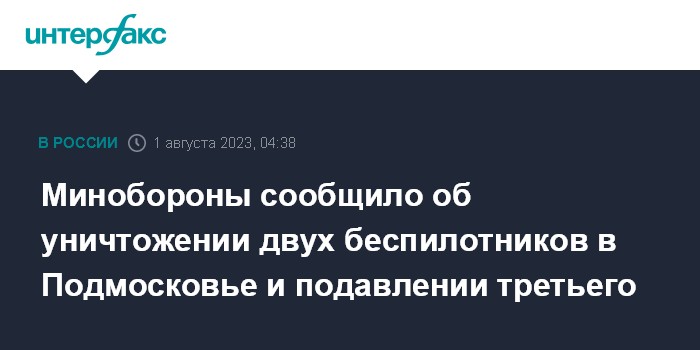 30 июля Минобороны РФ сообщало, что пресечена атака трех украинских беспилотников на объекты в Москве. По словам военных, один украинский дрон был сбит средствами ПВО над Одинцовским районом Подмосковья, еще два подавлены силами радиоэлектронной борьбы и упали на территории Москва-Сити.