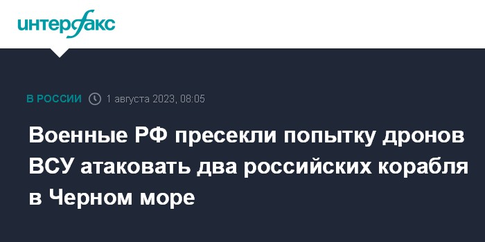 Москва. 1 августа. INTERFAX.RU - Министерство обороны России заявило о пресечении попытки украинских морских беспилотников атаковать два российских военных корабля в Черном море в 340 км от Севастополя.