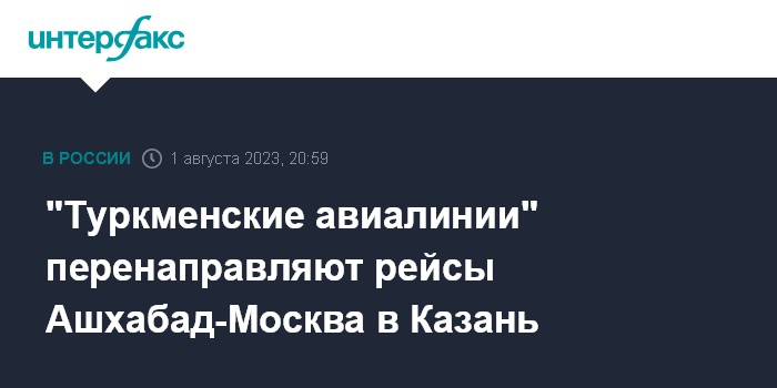 "В связи с воздушной обстановкой в московской воздушной зоне, а также на основании оценки рисков в целях обеспечения безопасности полетов начиная с 1 августа все рейсы АООТ "Авиакомпания "Туркменистан" по направлению Ашхабад-Москва-Ашхабад будут приостановлены и будут выполняться по маршруту Ашхабад-Казань-Ашхабад", - сообщает сайт перевозчика.