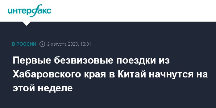 Москва. 2 августа. INTERFAX.RU - Безвизовый режим с Китаем восстановлен, первые поездки из Хабаровского края в Китай начнутся на этой неделе, сообщила министр туризма Хабаровского края Екатерина Пунтус в своем телеграм-канале в среду.